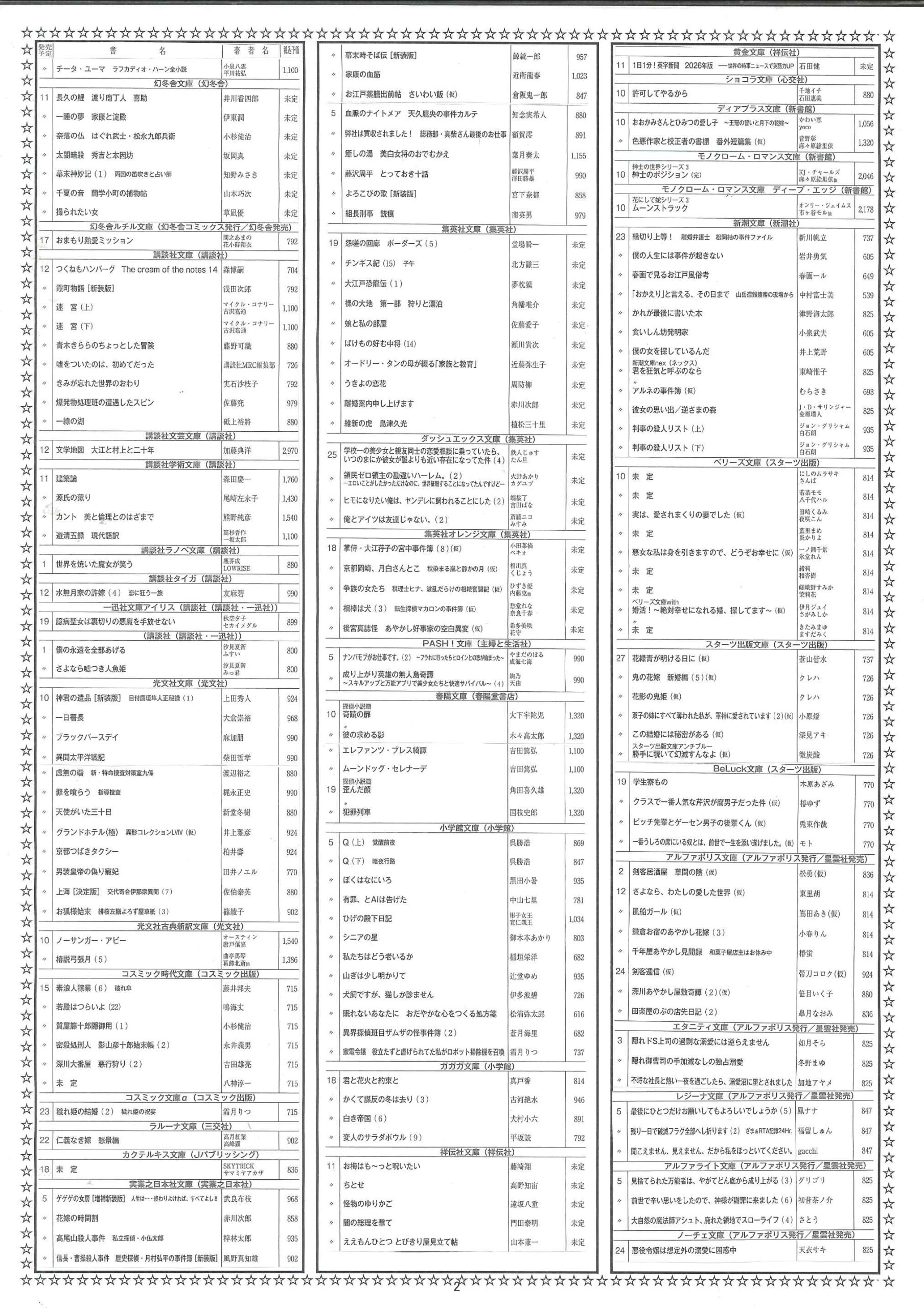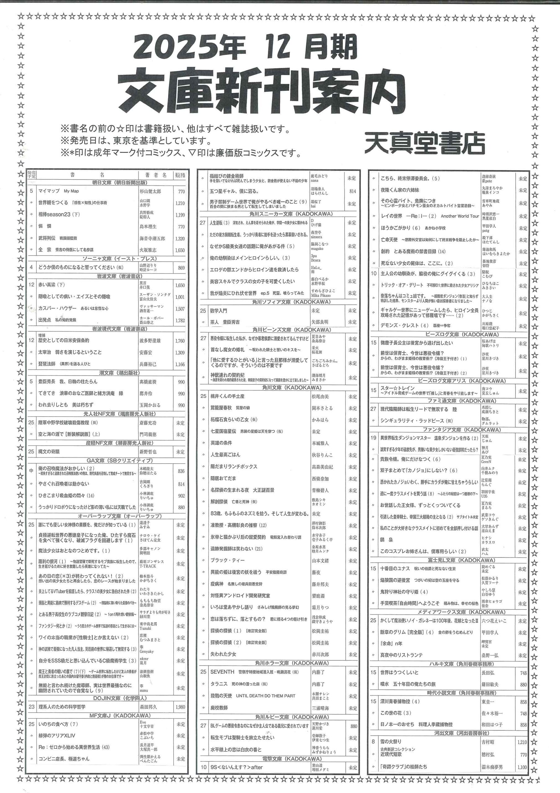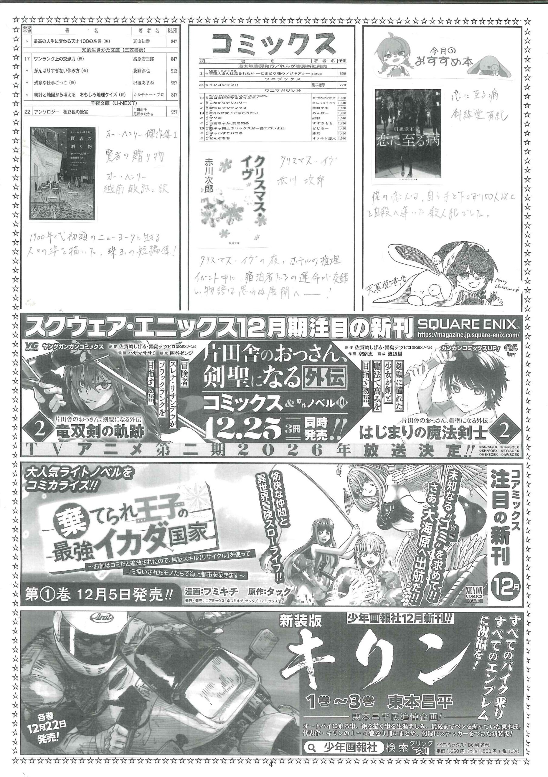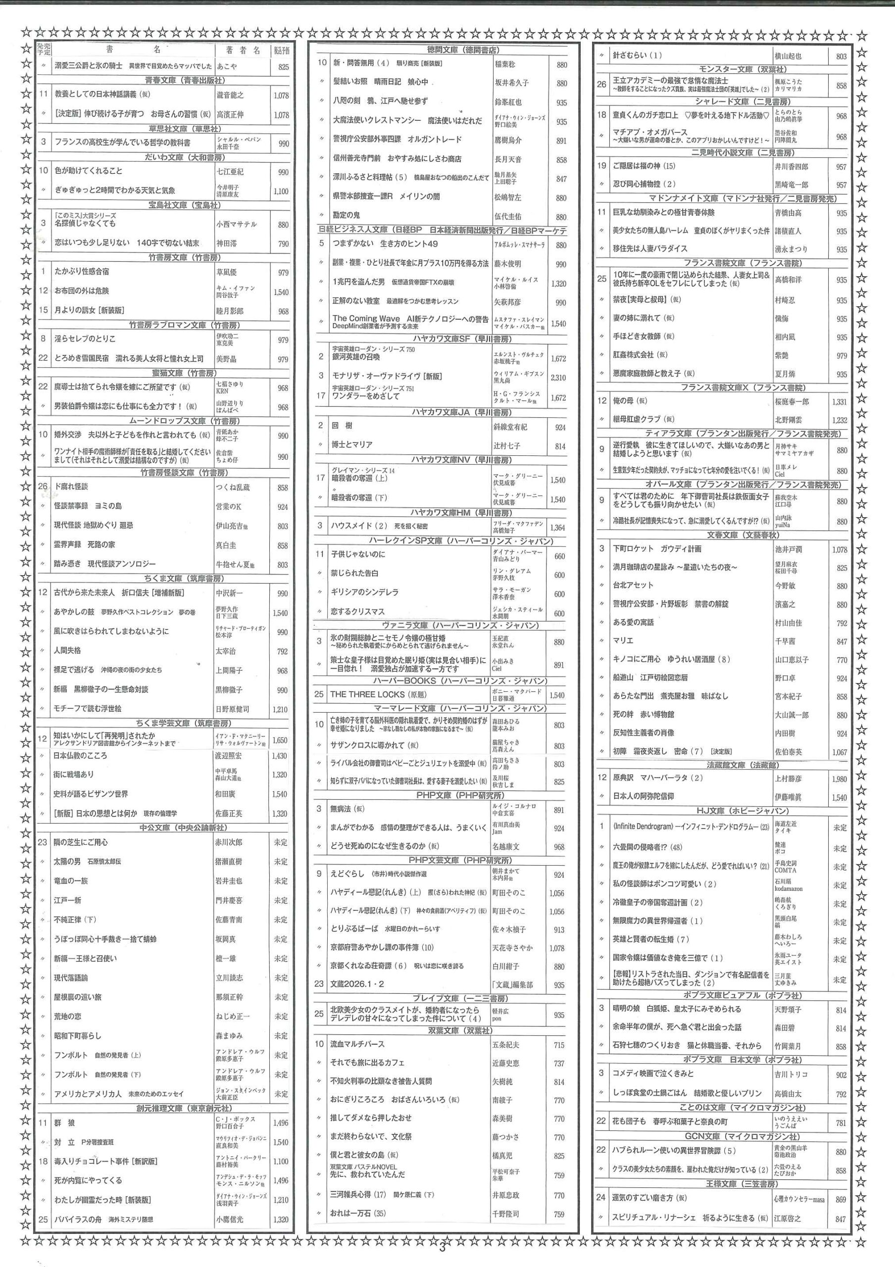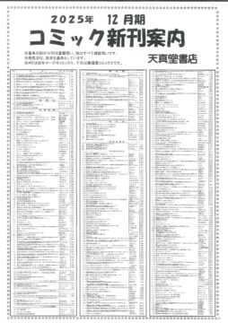 【2025年12月】文庫・コミック新刊案内 2025年11月30日 最終更新日時 : 2025年11月30日 天真堂書店 塩山店 2025年12月期、文庫・コミック新刊案内です。紙に印刷したものを各店舗で配布しております。発売日は東京を基準としています。発売日等内容は予定ですので変更になる場合があります。予めご了承ください。・2025年12月期文庫新刊案内 ・2025年12月期コミック新刊案内 是非お知り合いとシェアして下さい Facebook で共有するにはクリックしてください (新しいウィンドウで開きます) Facebook クリックして X で共有 (新しいウィンドウで開きます) X クリックして Pinterest で共有 (新しいウィンドウで開きます) Pinterest クリックして印刷 (新しいウィンドウで開きます) 印刷 関連