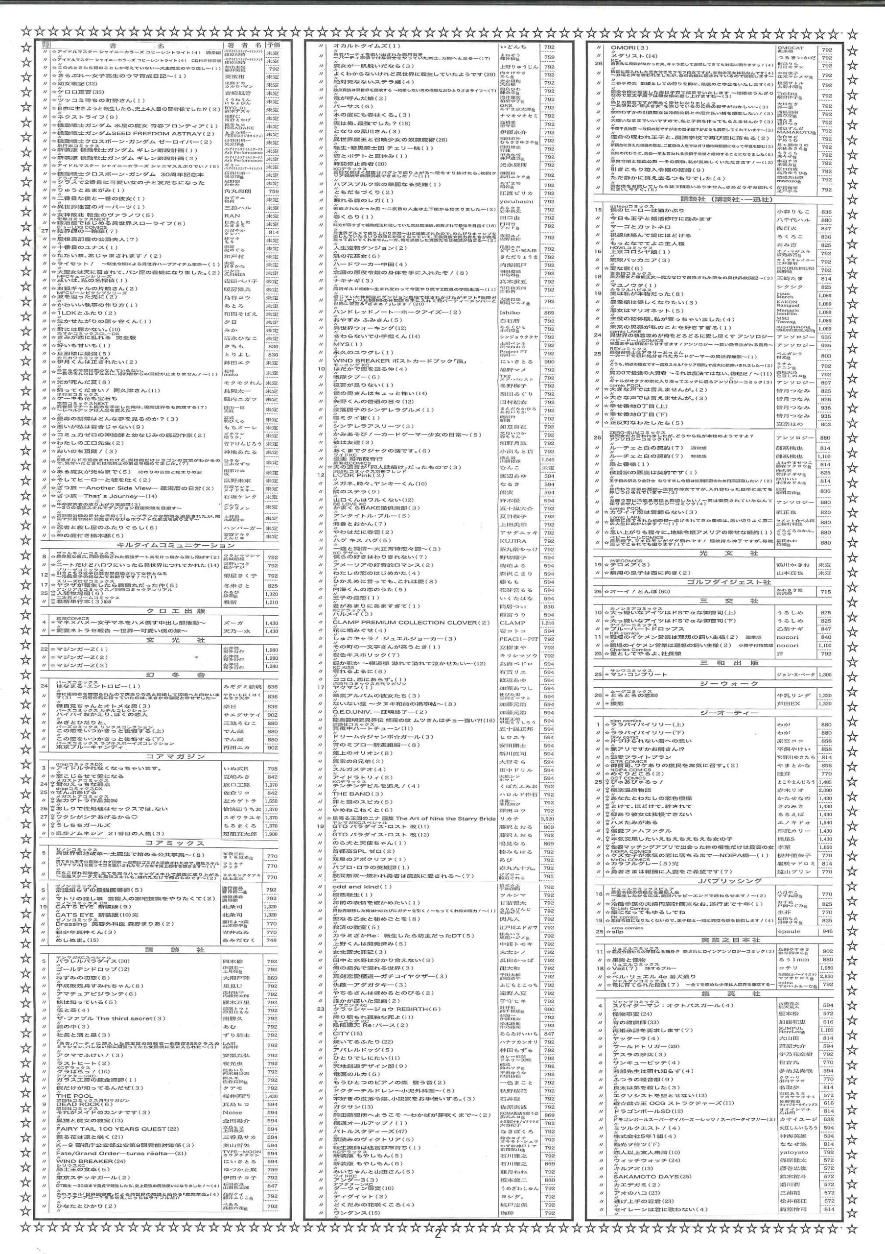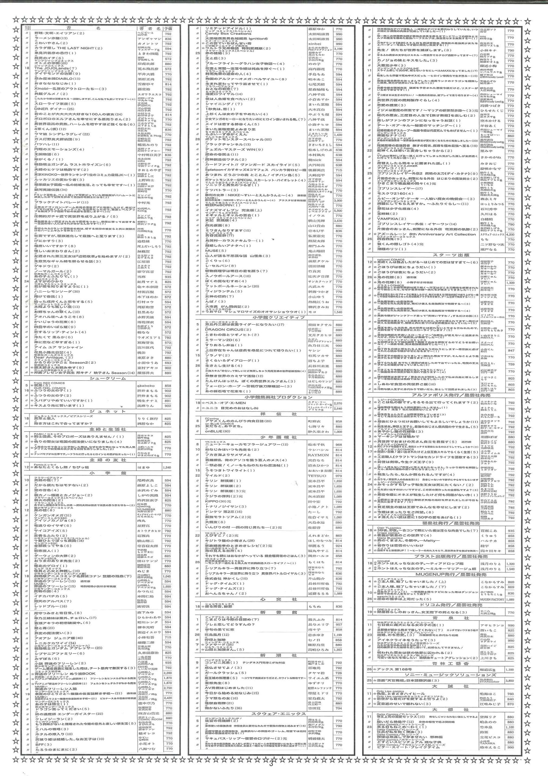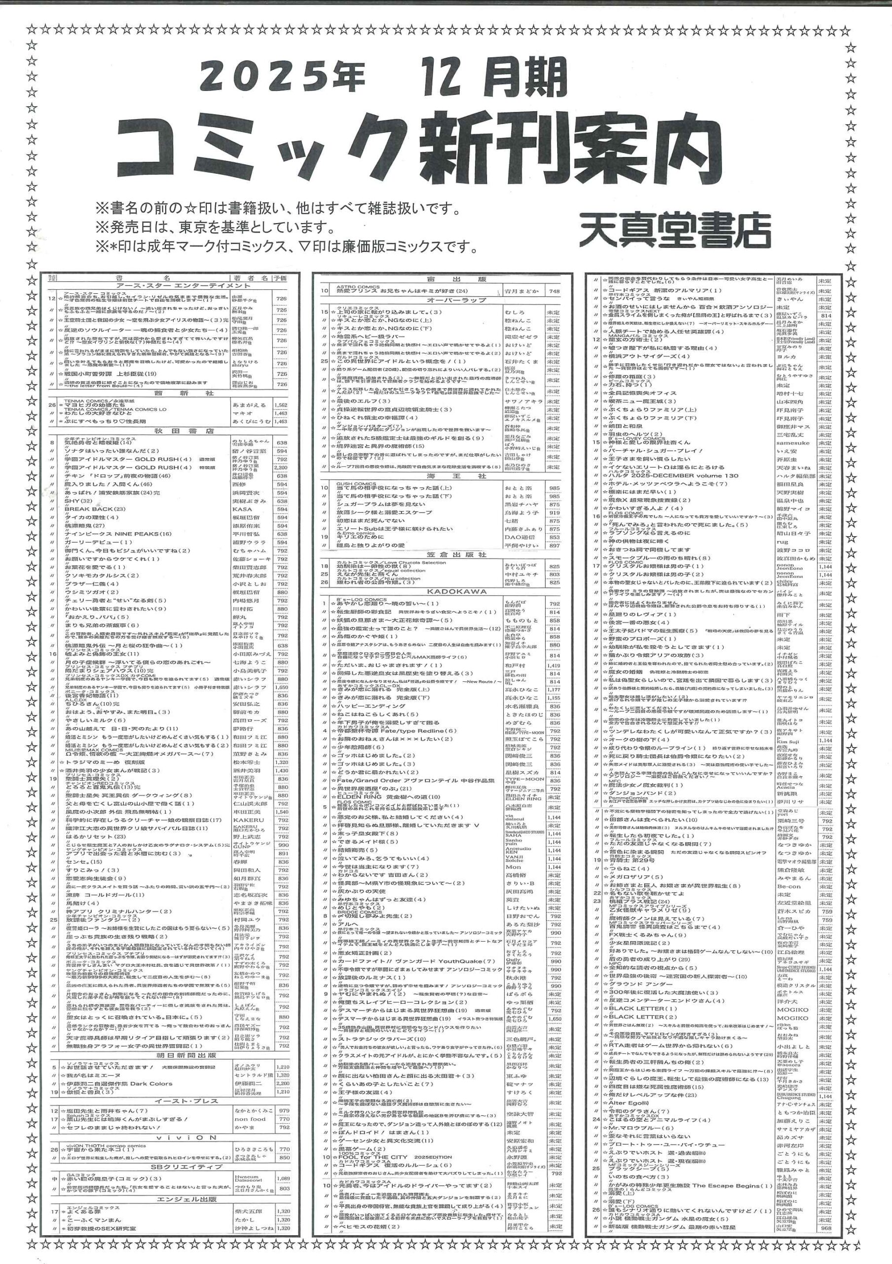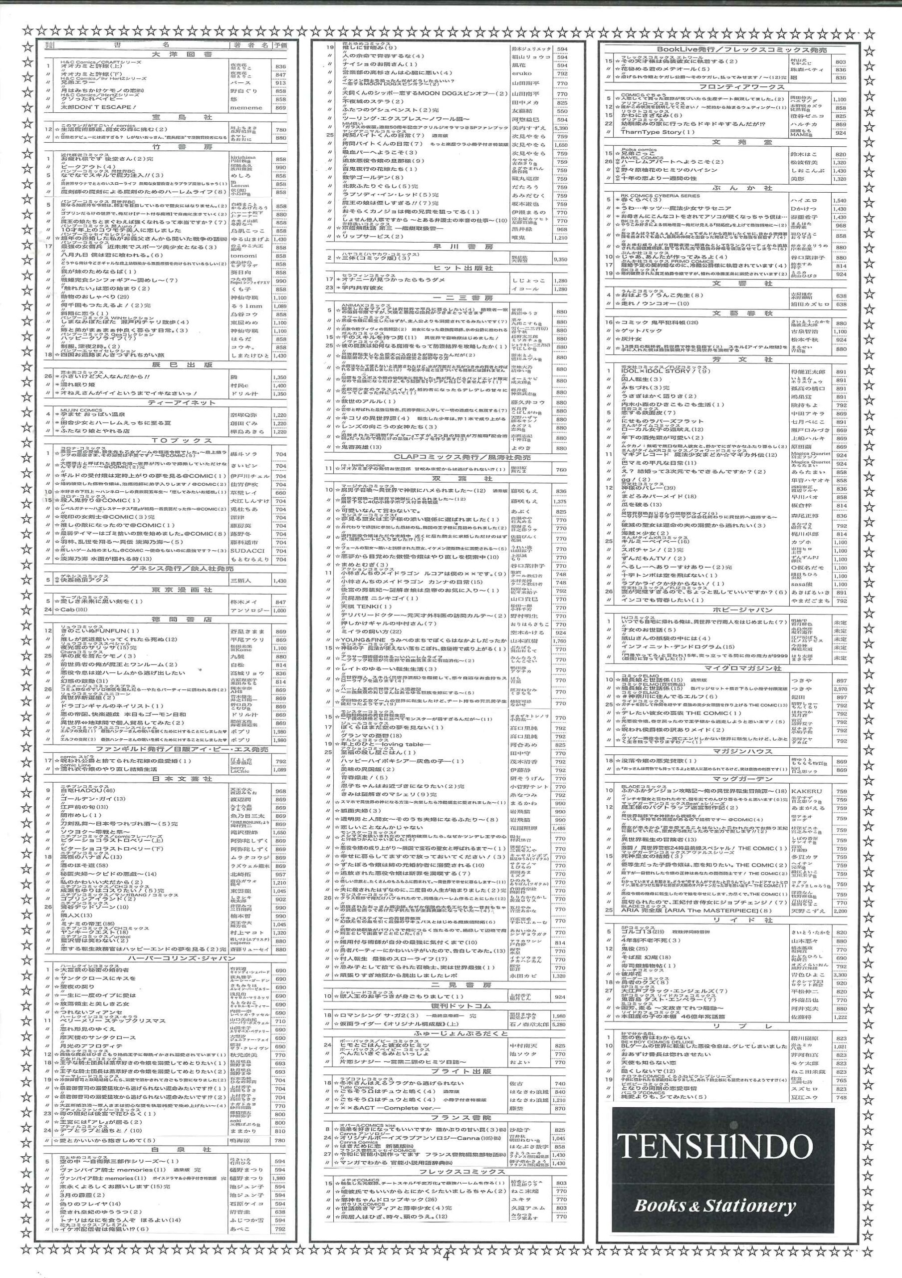 【2025年12月】文庫・コミック新刊案内 2025年11月30日 最終更新日時 : 2025年11月30日 天真堂書店 塩山店 2025年12月期、文庫・コミック新刊案内です。紙に印刷したものを各店舗で配布しております。発売日は東京を基準としています。発売日等内容は予定ですので変更になる場合があります。予めご了承ください。・2025年12月期文庫新刊案内 ・2025年12月期コミック新刊案内 是非お知り合いとシェアして下さい Facebook で共有するにはクリックしてください (新しいウィンドウで開きます) Facebook クリックして X で共有 (新しいウィンドウで開きます) X クリックして Pinterest で共有 (新しいウィンドウで開きます) Pinterest クリックして印刷 (新しいウィンドウで開きます) 印刷 関連