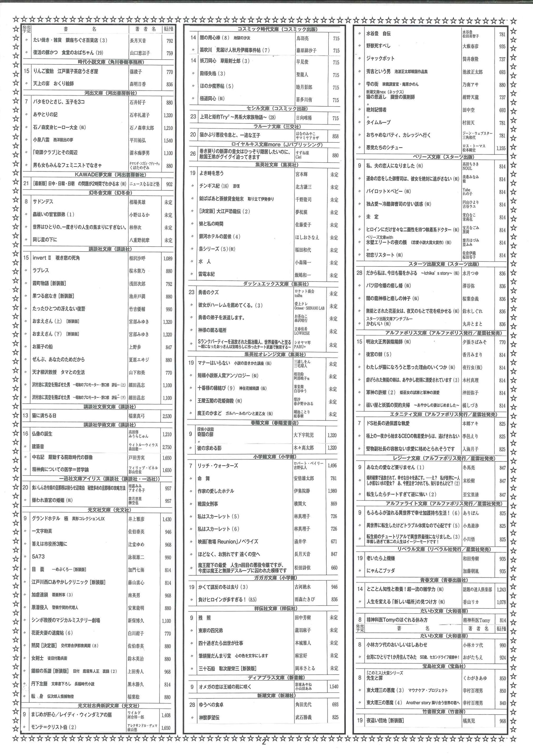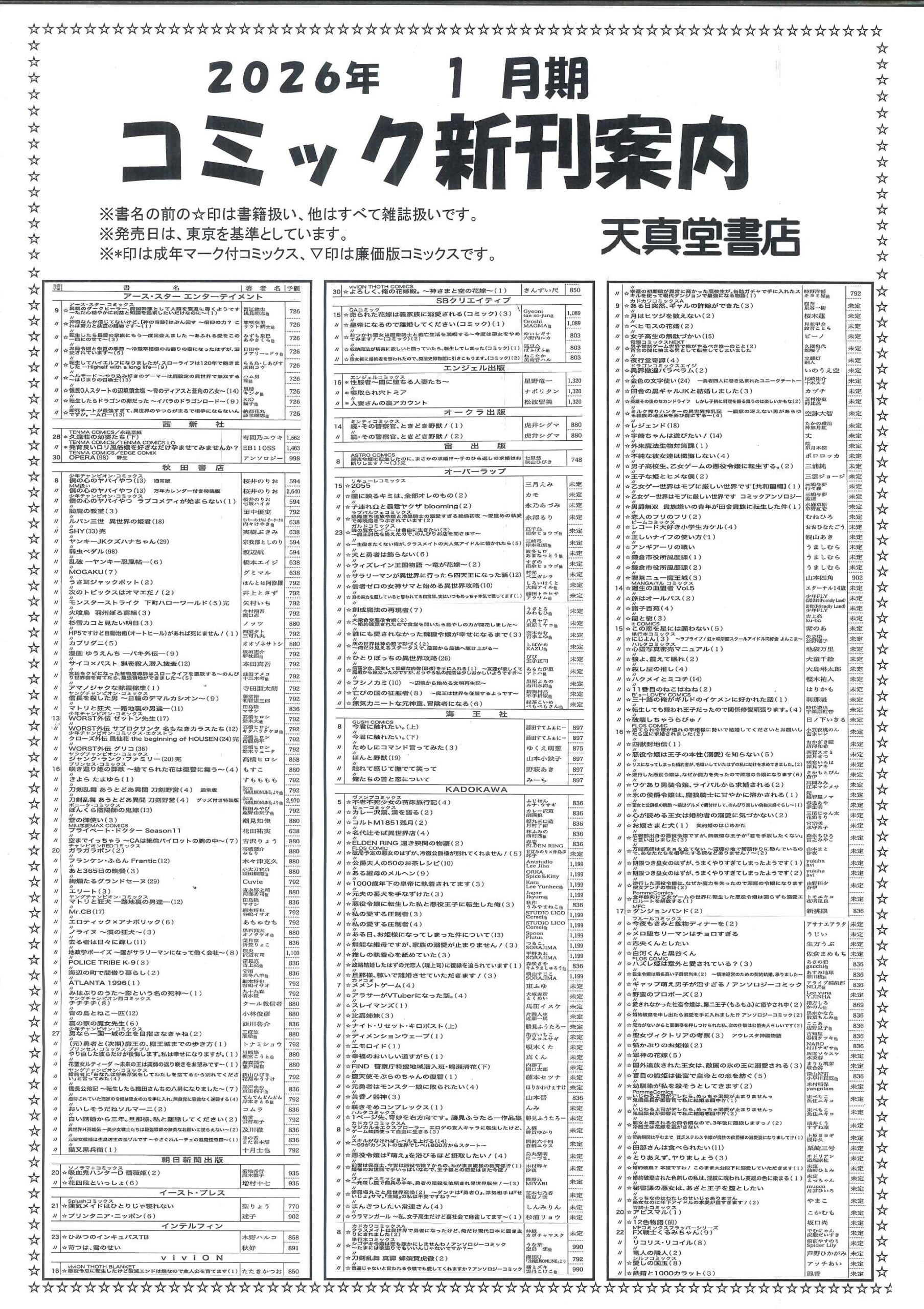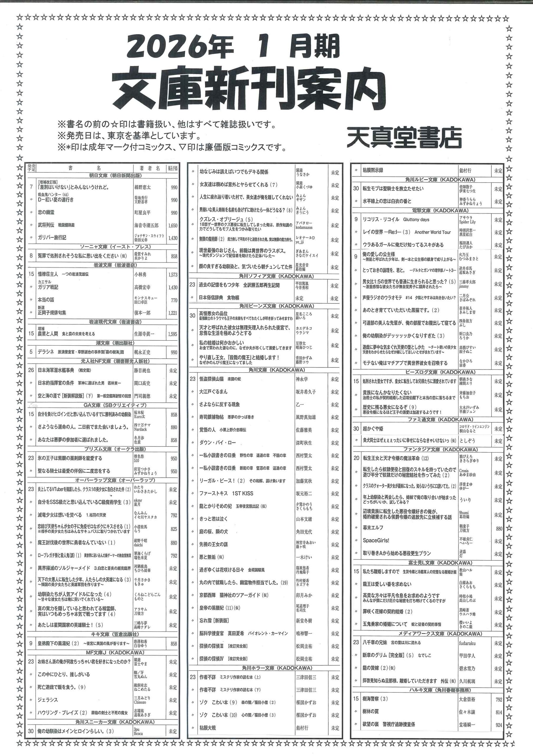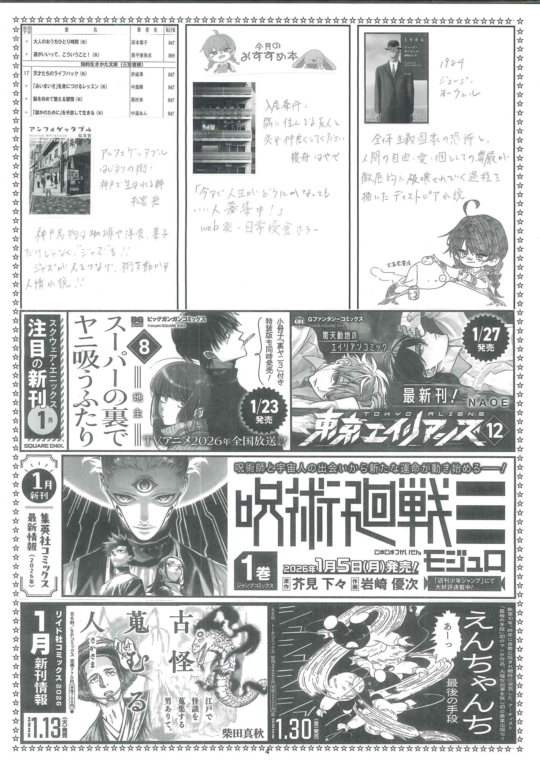 【2026年1月】文庫・コミック新刊案内 2025年12月29日 最終更新日時 : 2025年12月29日 天真堂書店 塩山店 2026年1月期、文庫・コミック新刊案内です。紙に印刷したものを各店舗で配布しております。発売日は東京を基準としています。発売日等内容は予定ですので変更になる場合があります。予めご了承ください。・2026年1月期文庫新刊案内 ・2026年1月期コミック新刊案内 是非お知り合いとシェアして下さい Facebook で共有するにはクリックしてください (新しいウィンドウで開きます) Facebook クリックして X で共有 (新しいウィンドウで開きます) X クリックして Pinterest で共有 (新しいウィンドウで開きます) Pinterest クリックして印刷 (新しいウィンドウで開きます) 印刷 関連