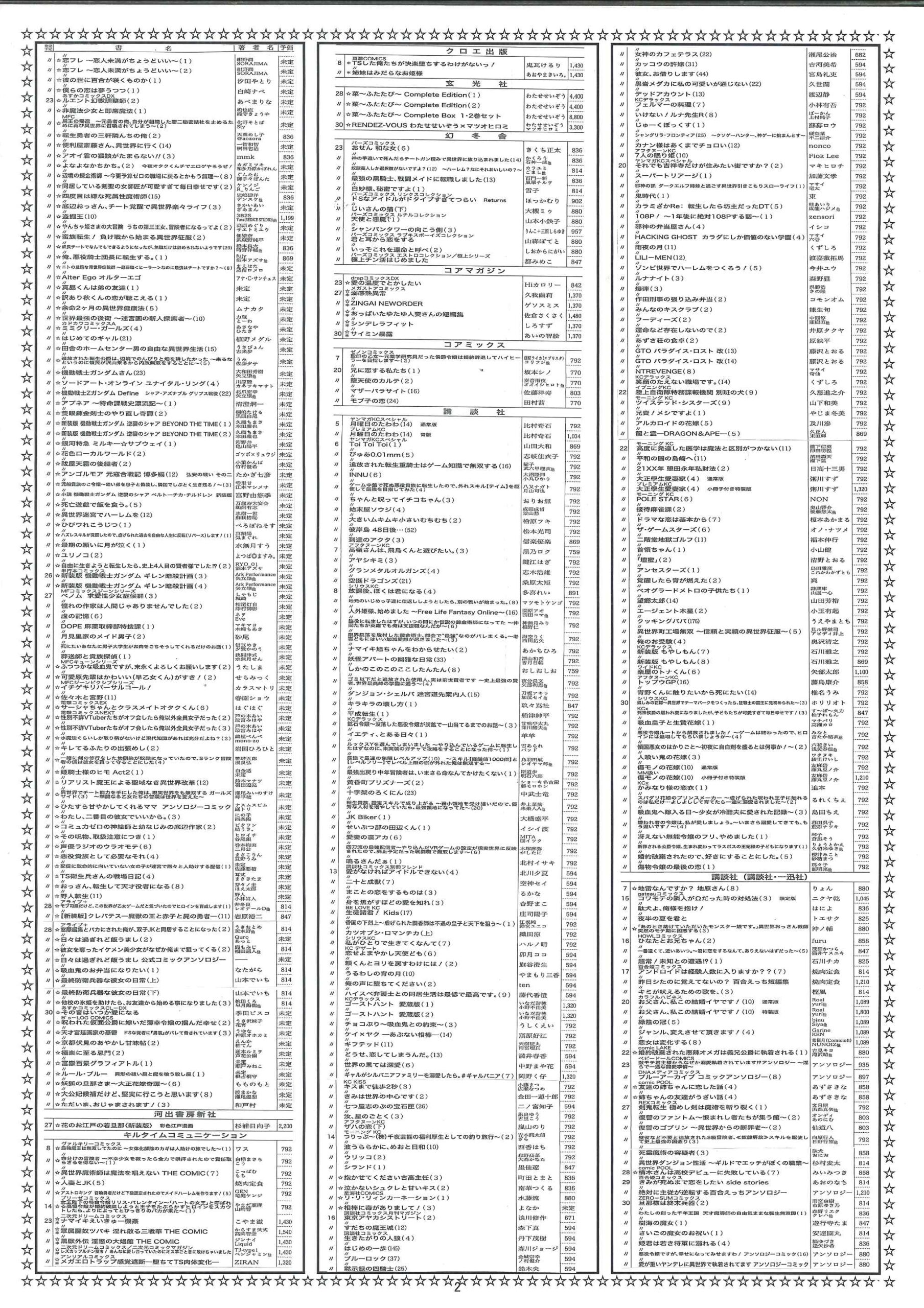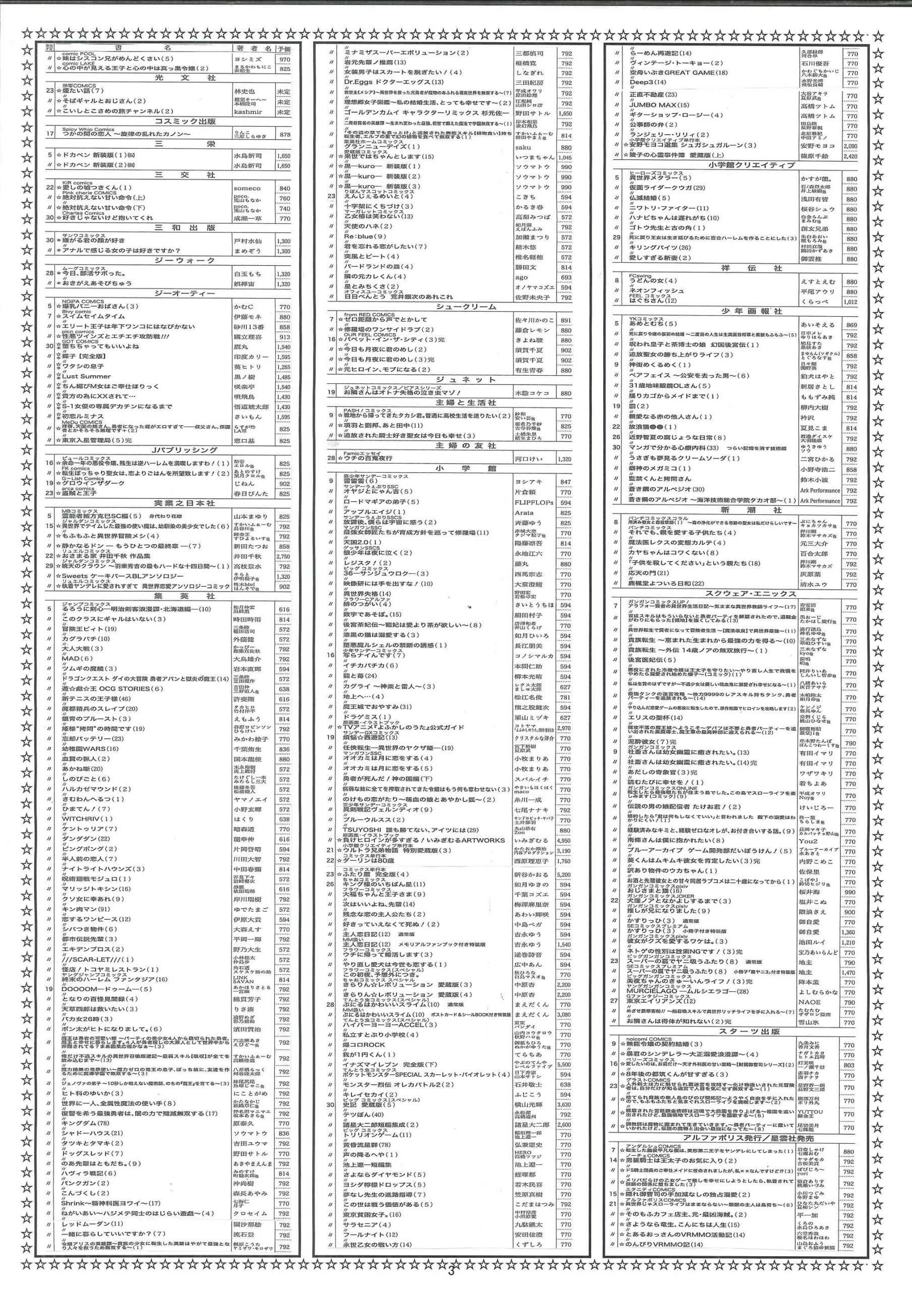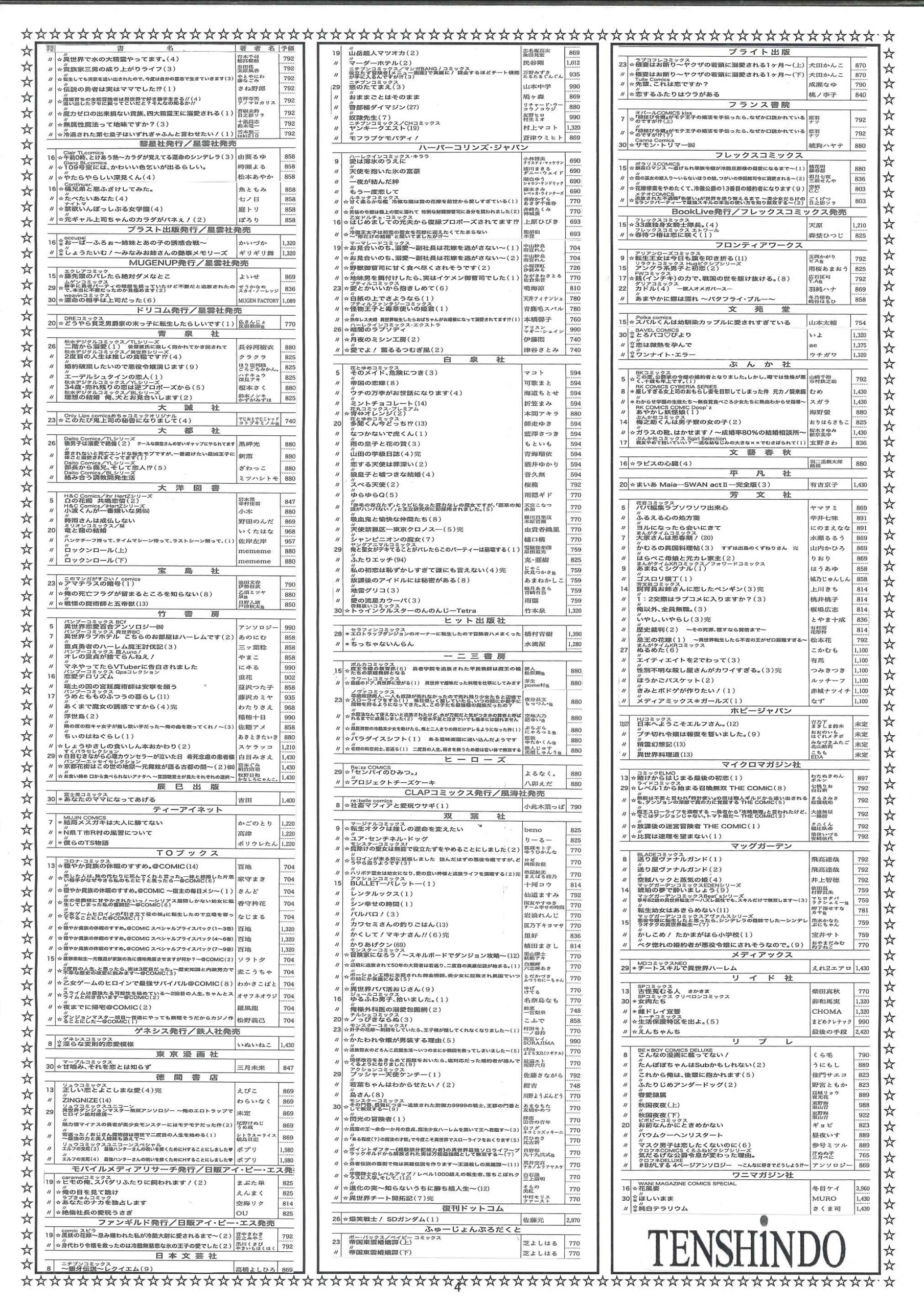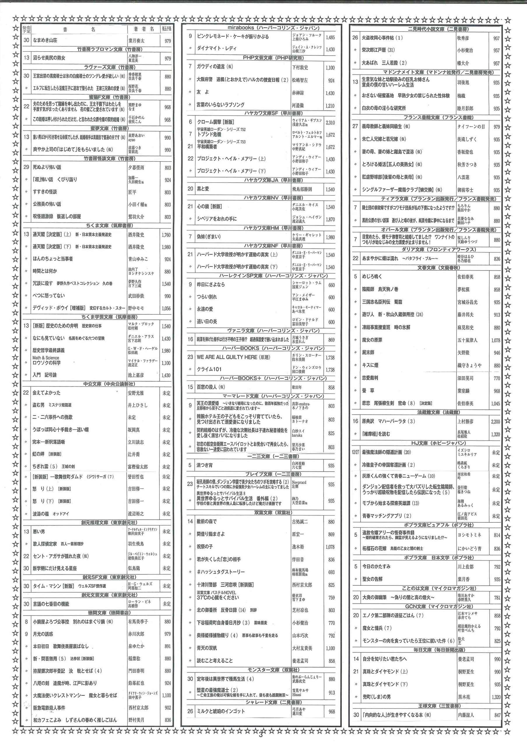 【2026年1月】文庫・コミック新刊案内 2025年12月29日 最終更新日時 : 2025年12月29日 天真堂書店 塩山店 2026年1月期、文庫・コミック新刊案内です。紙に印刷したものを各店舗で配布しております。発売日は東京を基準としています。発売日等内容は予定ですので変更になる場合があります。予めご了承ください。・2026年1月期文庫新刊案内 ・2026年1月期コミック新刊案内 是非お知り合いとシェアして下さい Facebook で共有するにはクリックしてください (新しいウィンドウで開きます) Facebook クリックして X で共有 (新しいウィンドウで開きます) X クリックして Pinterest で共有 (新しいウィンドウで開きます) Pinterest クリックして印刷 (新しいウィンドウで開きます) 印刷 関連